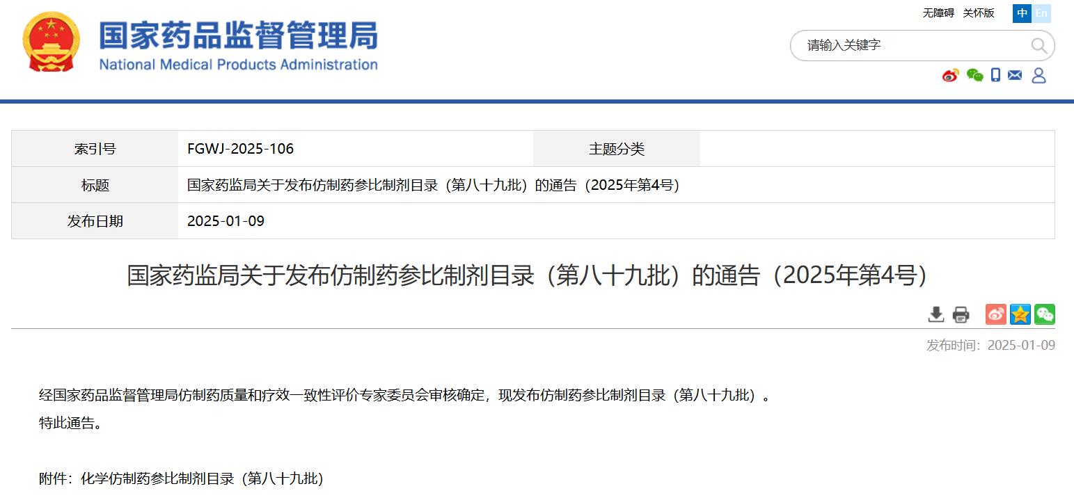 國(guó)家藥監(jiān)局關(guān)于發(fā)布仿制藥參比制劑目錄(第八十九批)的通告(2025年第4號(hào))