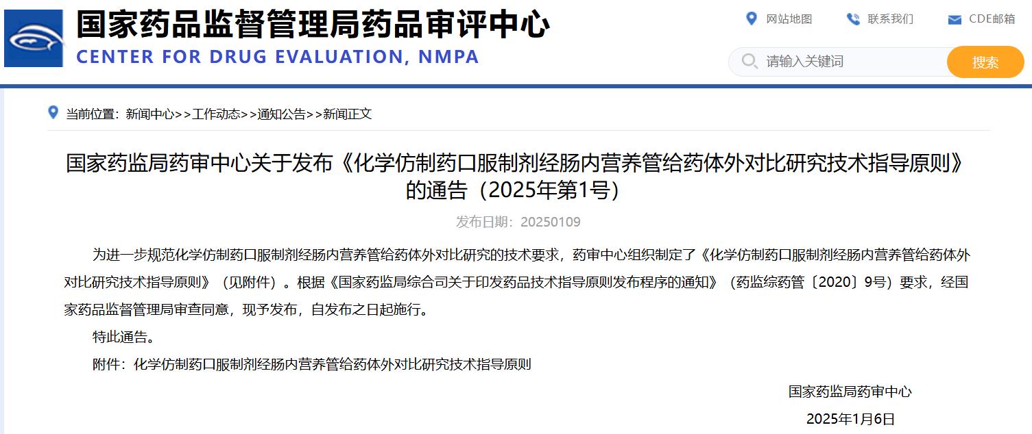 國(guó)家藥監(jiān)局藥審中心關(guān)于發(fā)布《化學(xué)仿制藥口服制劑經(jīng)腸內(nèi)營(yíng)養(yǎng)管給藥體外對(duì)比研究技術(shù)指導(dǎo)原則》的通告(2025年第1號(hào))