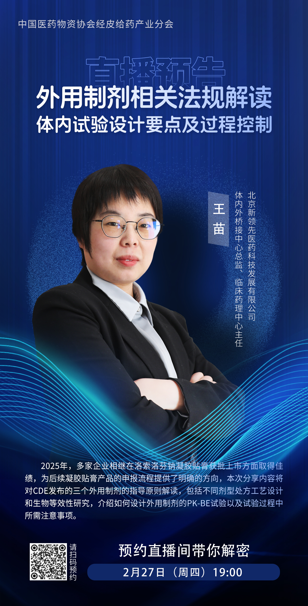 為幫助大家深入理解這些關(guān)鍵內(nèi)容,2月27日(本周四),中國醫(yī)藥物資協(xié)會(huì)經(jīng)皮給藥產(chǎn)業(yè)分會(huì)副會(huì)長單位,北京新領(lǐng)先醫(yī)藥科技發(fā)展有限公司體內(nèi)外橋接中心總監(jiān)、臨床藥理中心主任王苗,為大家?guī)怼锻庥弥苿┫嚓P(guān)法規(guī)解讀,體內(nèi)試驗(yàn)設(shè)計(jì)要點(diǎn)及過程控制》的專業(yè)解讀。王苗主任憑借深厚的專業(yè)知識(shí)和豐富的實(shí)踐經(jīng)驗(yàn),將針對(duì)CDE發(fā)布的三個(gè)外用制劑指導(dǎo)原則進(jìn)行深度剖析,包括不同劑型處方工藝設(shè)計(jì)和生物等效性研究;介紹如何設(shè)計(jì)外用制劑的PK-BE試驗(yàn)以及試驗(yàn)過程中所需注意事項(xiàng)。