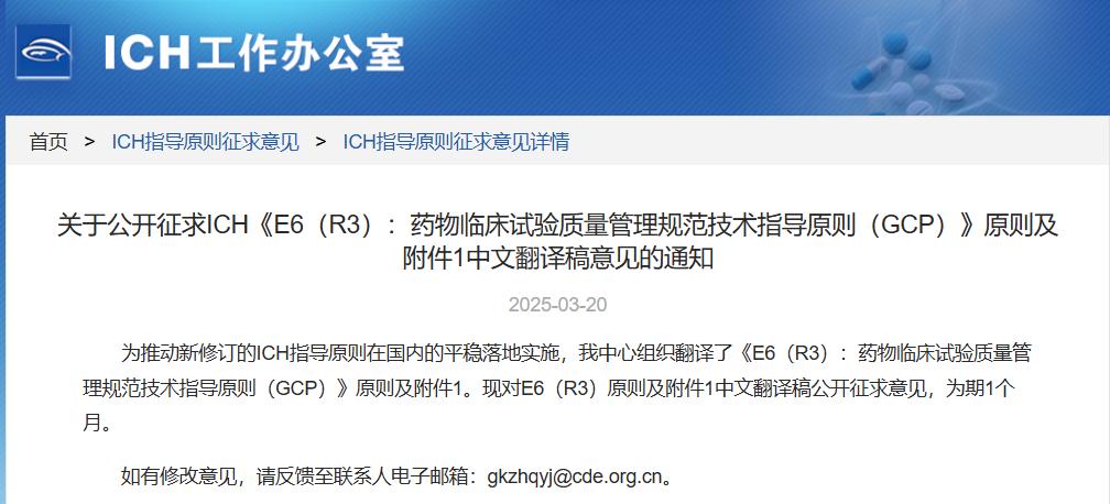 關(guān)于公開征求ICH《E6(R3):藥物臨床試驗(yàn)質(zhì)量管理規(guī)范技術(shù)指導(dǎo)原則(GCP)》原則及附件1中文翻譯稿意見(jiàn)的通知