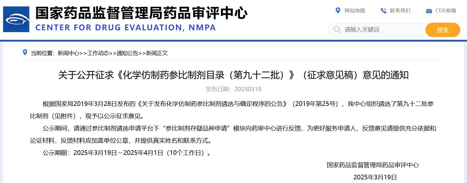 關(guān)于公開征求《化學(xué)仿制藥參比制劑目錄(第九十二批)》(征求意見(jiàn)稿)意見(jiàn)的通知