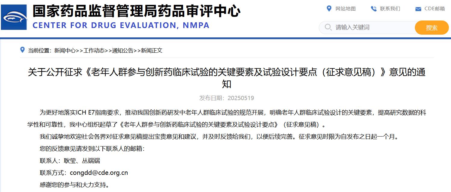 關于公開征求《老年人群參與創(chuàng)新藥臨床試驗的關鍵要素及試驗設計要點(征求意見稿)》意見的通知