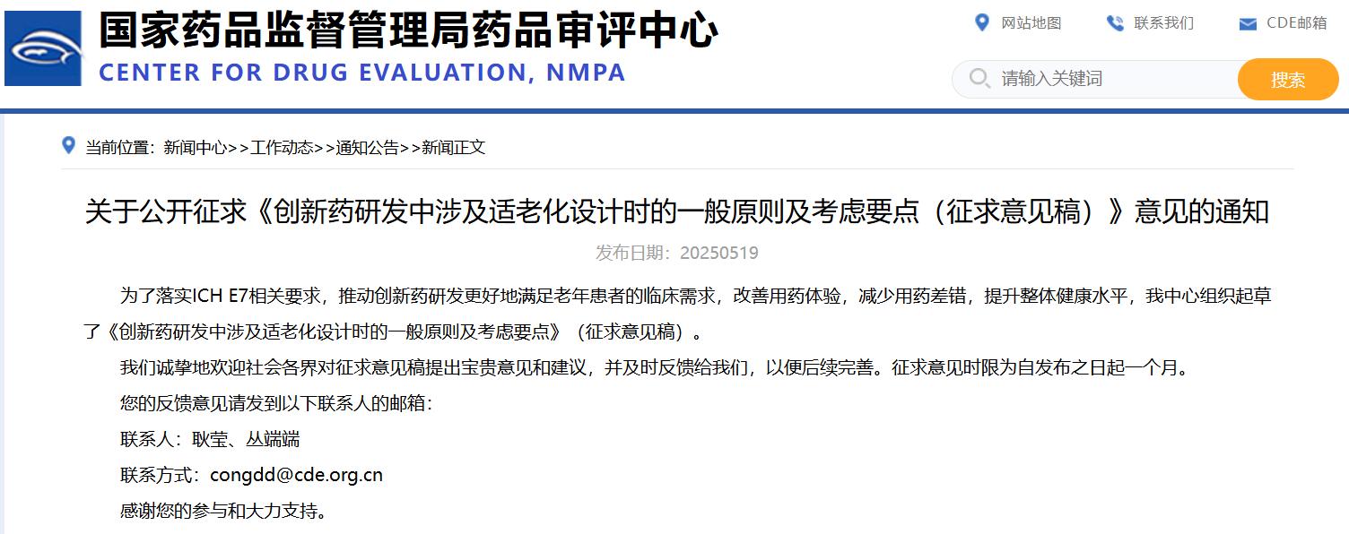 關于公開征求《創(chuàng)新藥研發(fā)中涉及適老化設計時的一般原則及考慮要點(征求意見稿)》意見的通知