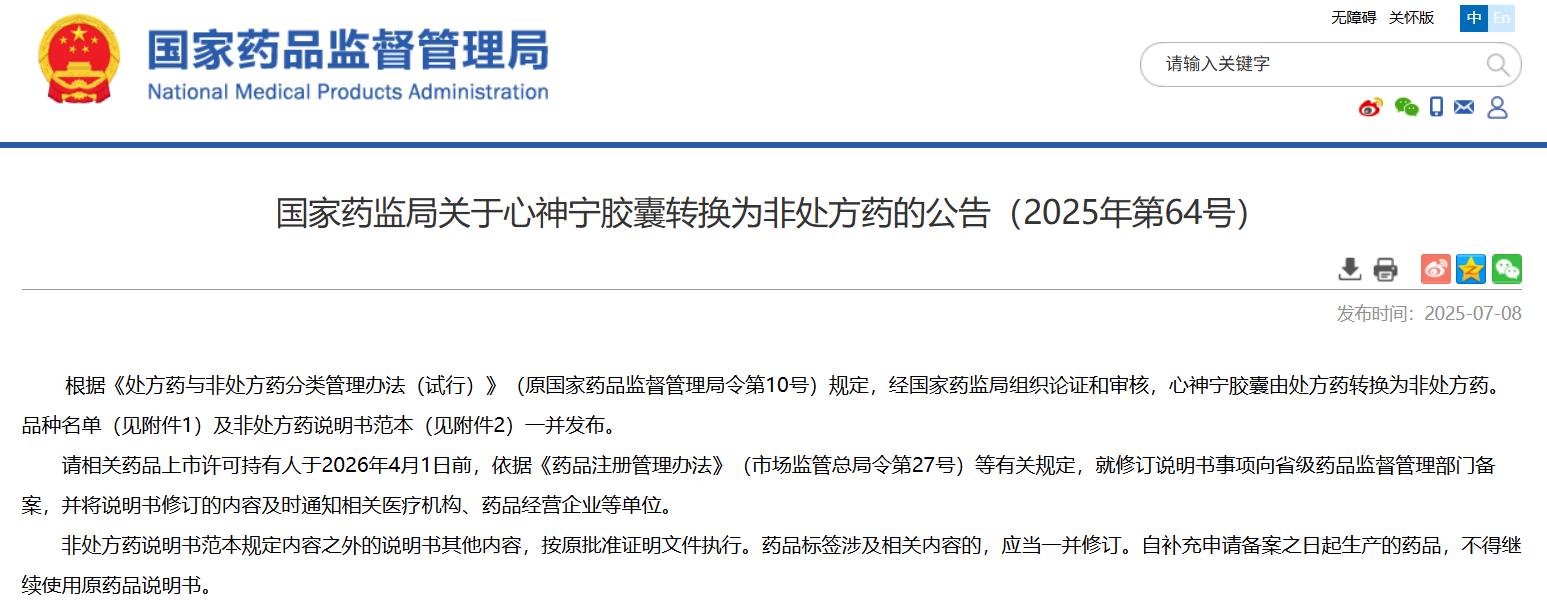 國家藥監(jiān)局關(guān)于心神寧膠囊轉(zhuǎn)換為非處方藥的公告(2025年第64號(hào))