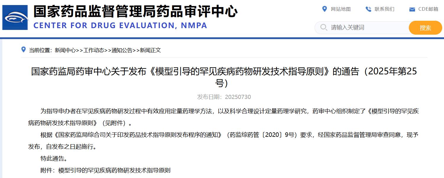國(guó)家藥監(jiān)局藥審中心關(guān)于發(fā)布《模型引導(dǎo)的罕見(jiàn)疾病藥物研發(fā)技術(shù)指導(dǎo)原則》的通告(2025年第25號(hào))