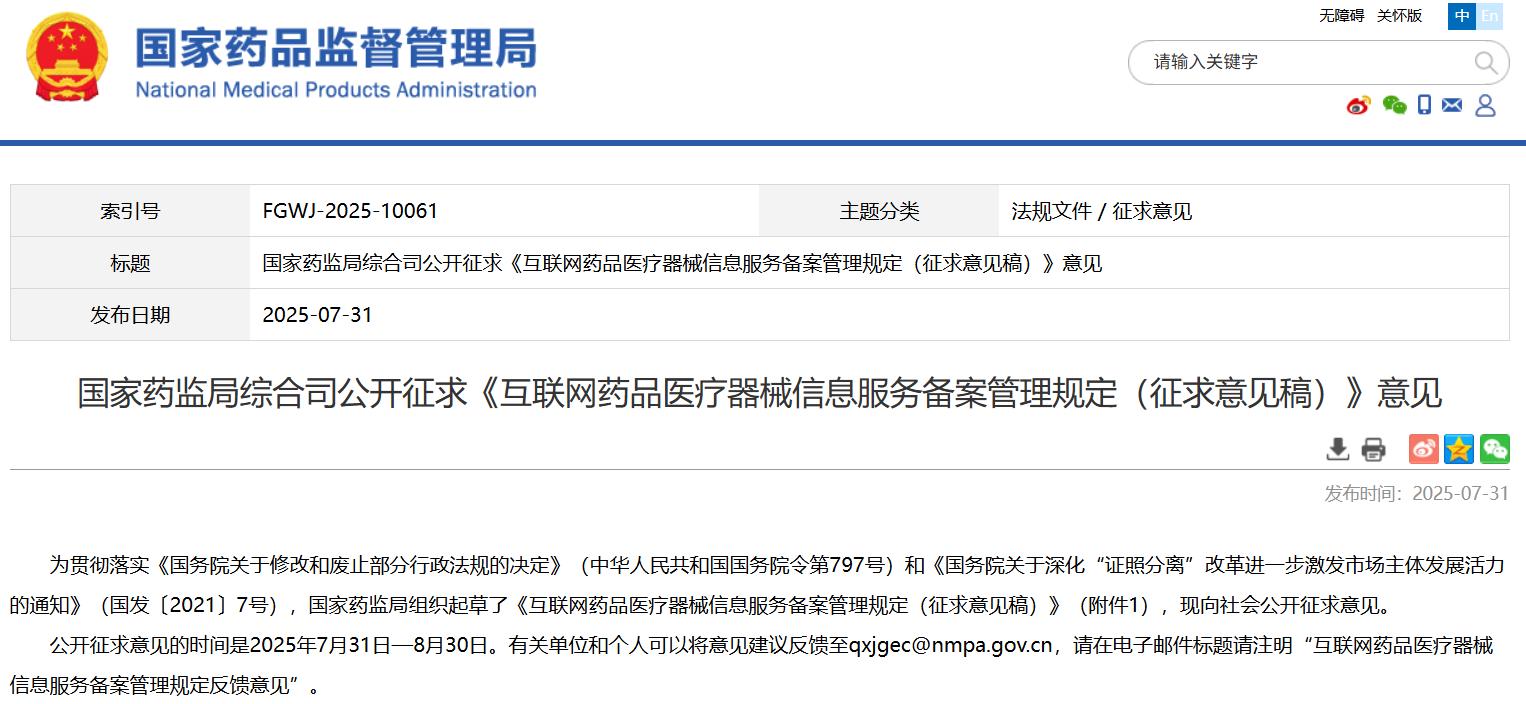 國(guó)家藥監(jiān)局綜合司公開(kāi)征求《互聯(lián)網(wǎng)藥品醫(yī)療器械信息服務(wù)備案管理規(guī)定(征求意見(jiàn)稿)》意見(jiàn)