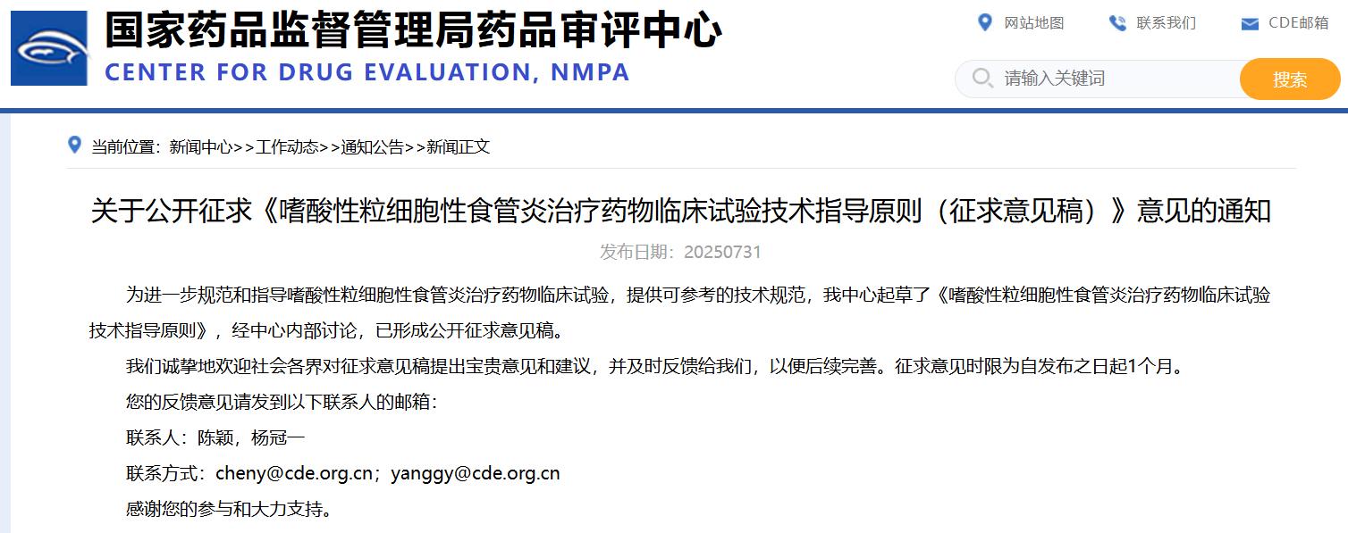 關(guān)于公開(kāi)征求《嗜酸性粒細(xì)胞性食管炎治療藥物臨床試驗(yàn)技術(shù)指導(dǎo)原則(征求意見(jiàn)稿)》意見(jiàn)的通知