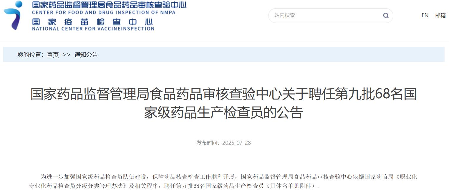 國(guó)家藥品監(jiān)督管理局食品藥品審核查驗(yàn)中心關(guān)于聘任第九批68名國(guó)家級(jí)藥品生產(chǎn)檢查員的公告