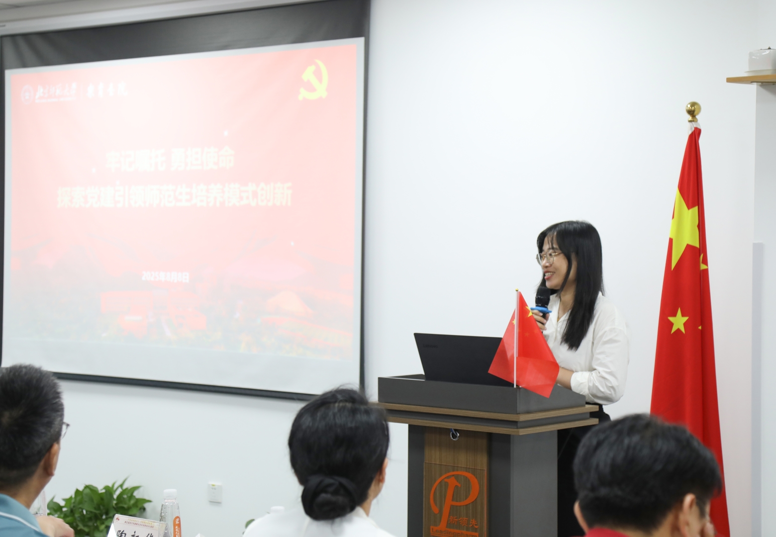北師大樂育書院明德苑舍師生聯(lián)合黨支部書記曹美新針對《黨建引領下的師范生培養(yǎng)創(chuàng)新路徑探索》展開講解,樂育學院堅持為國育才,落實習近平總書記“回信精神”,聚焦“三全育人”抓黨建,引領了師范報國新風尚。