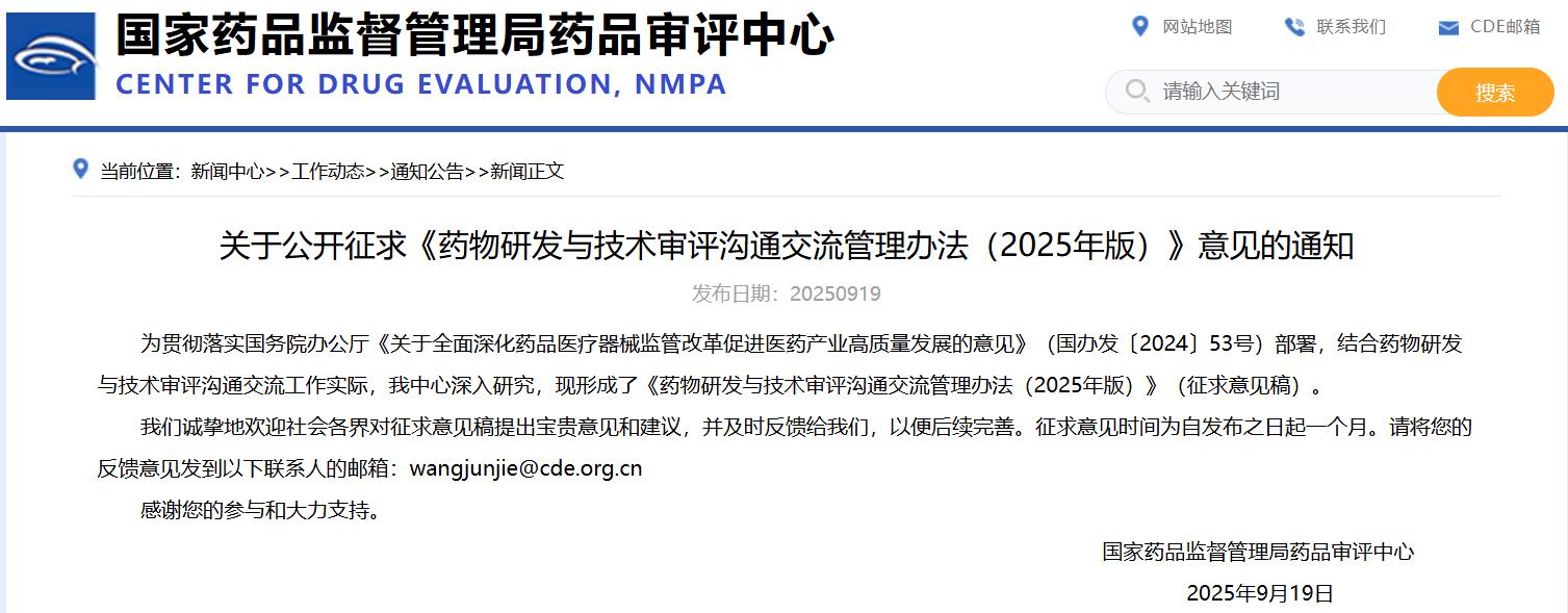 關(guān)于公開征求《藥物研發(fā)與技術(shù)審評溝通交流管理辦法(2025年版)》意見的通知
