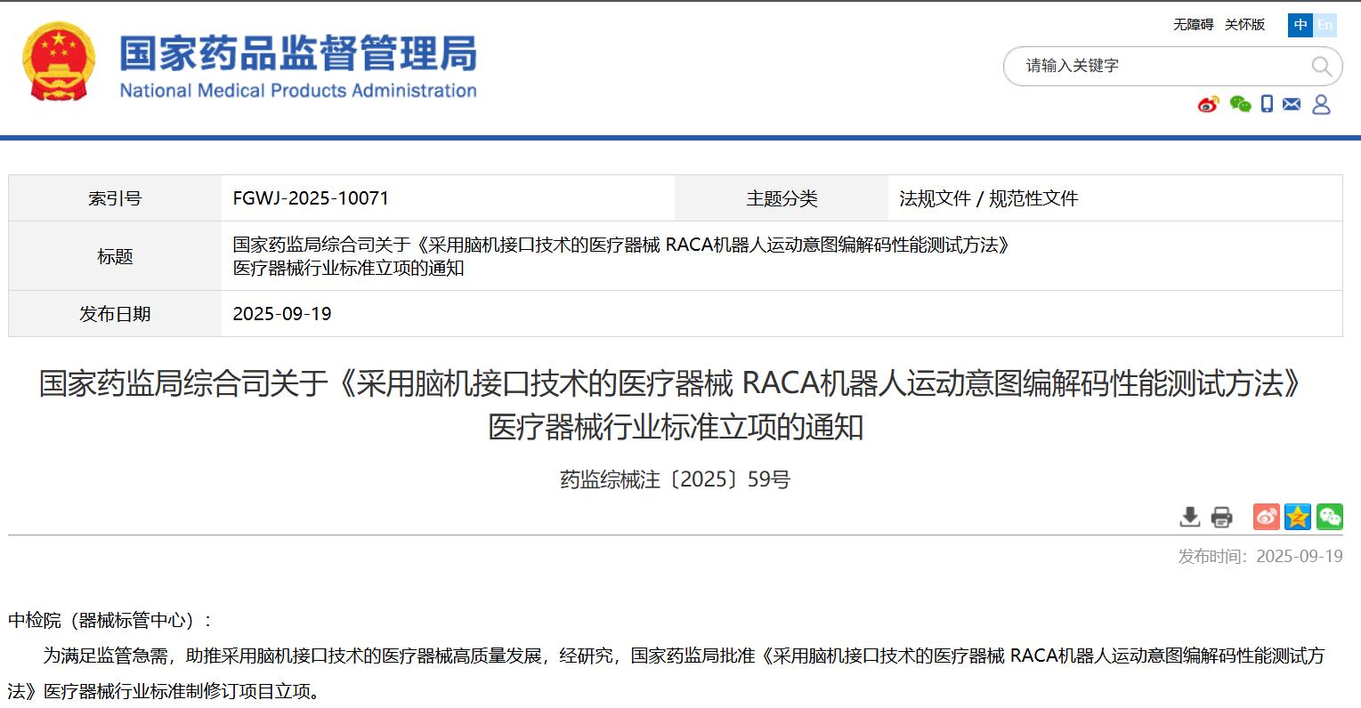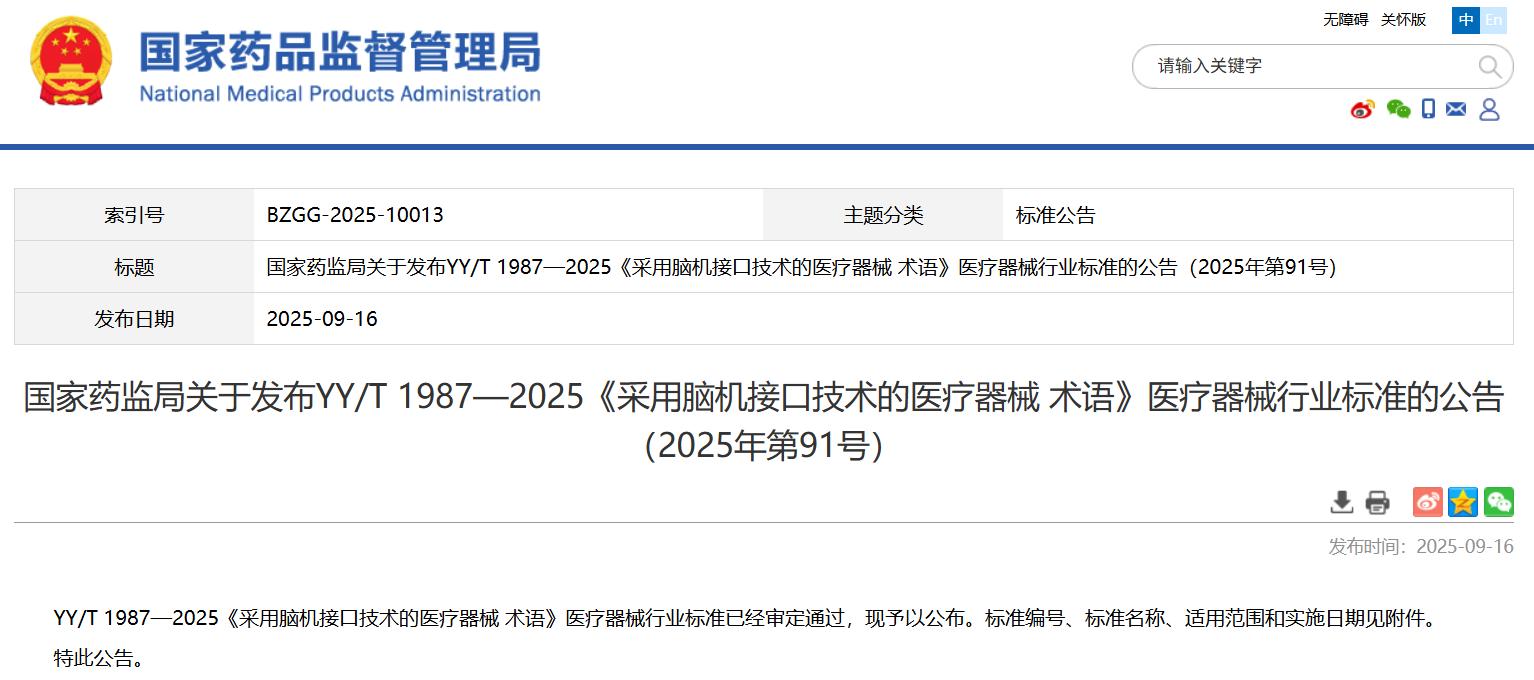 國家藥監(jiān)局關(guān)于發(fā)布YY/T 1987—2025《采用腦機(jī)接口技術(shù)的醫(yī)療器械 術(shù)語》醫(yī)療器械行業(yè)標(biāo)準(zhǔn)的公告(2025年第91號
