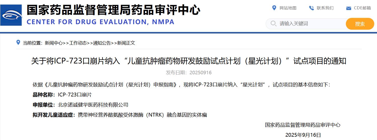 關(guān)于將ICP-723口崩片納入“兒童抗腫瘤藥物研發(fā)鼓勵試點(diǎn)計劃(星光計劃)”試點(diǎn)項目的通知