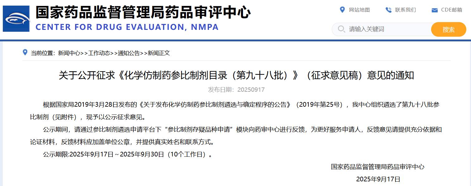 關(guān)于公開征求《化學(xué)仿制藥參比制劑目錄(第九十八批)》(征求意見稿)意見的通知