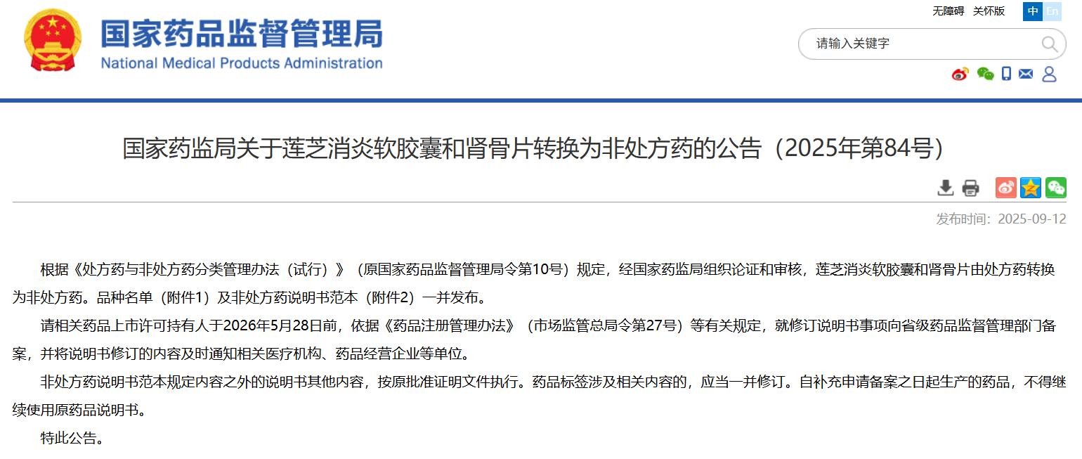 國家藥監(jiān)局關(guān)于蓮芝消炎軟膠囊和腎骨片轉(zhuǎn)換為非處方藥的公告(2025年第84號)