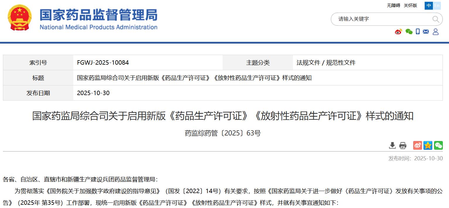 國家藥監(jiān)局綜合司關(guān)于啟用新版《藥品生產(chǎn)許可證》《放射性藥品生產(chǎn)許可證》樣式的通知