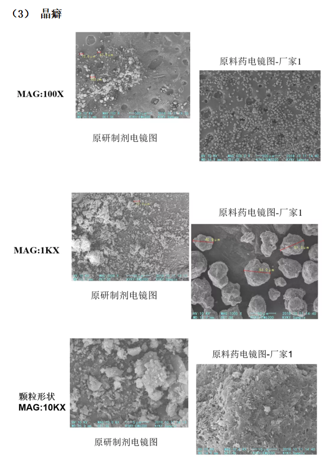 結(jié)果:隨著電鏡掃描放大倍數(shù)的增加,可以更加清楚地看出原料藥和原研制劑的差異:原研制劑的顆粒明顯小于原料藥,而廠家1原料藥的表面更加緊實(shí),所以溶解時(shí)間也會(huì)更長(zhǎng)。