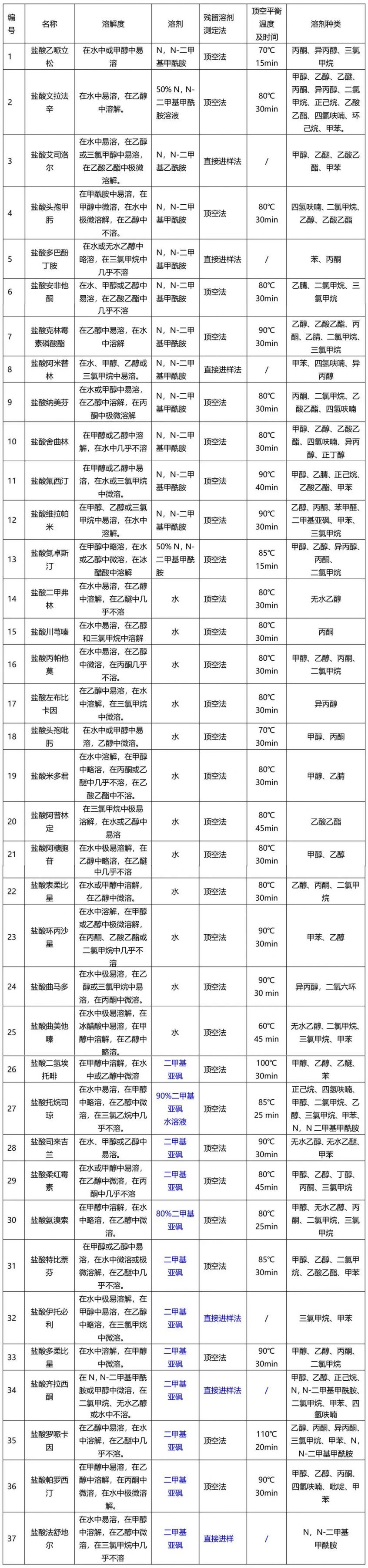 ChP二部鹽酸鹽品種殘留溶劑檢測信息匯總表