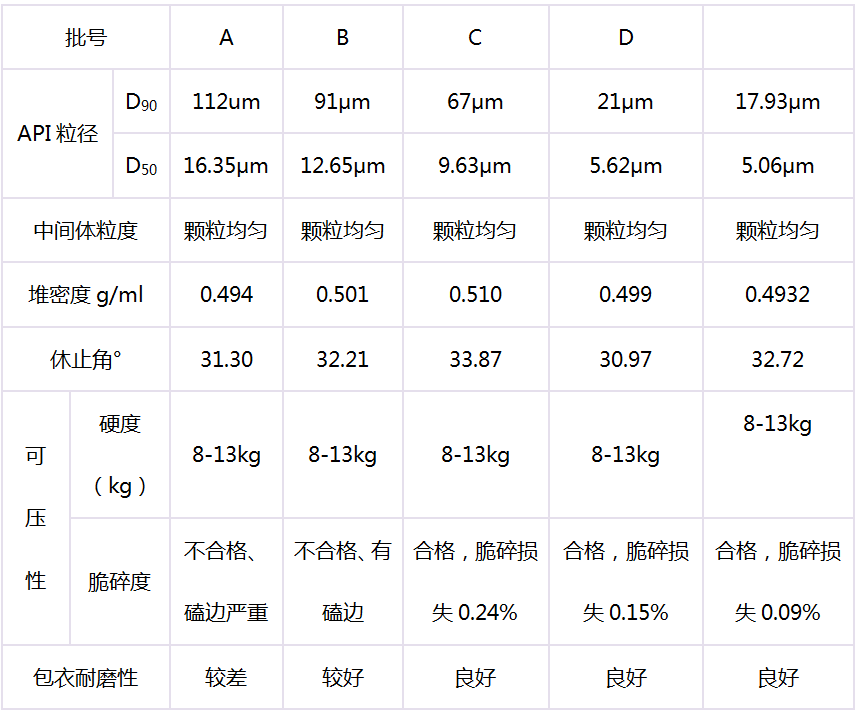 d. 改進(jìn)濕法制粒工藝,控制中間體顆粒粒度分布,細(xì)化包衣參數(shù),保證在包衣初始階段片劑片面不出現(xiàn)劃痕。