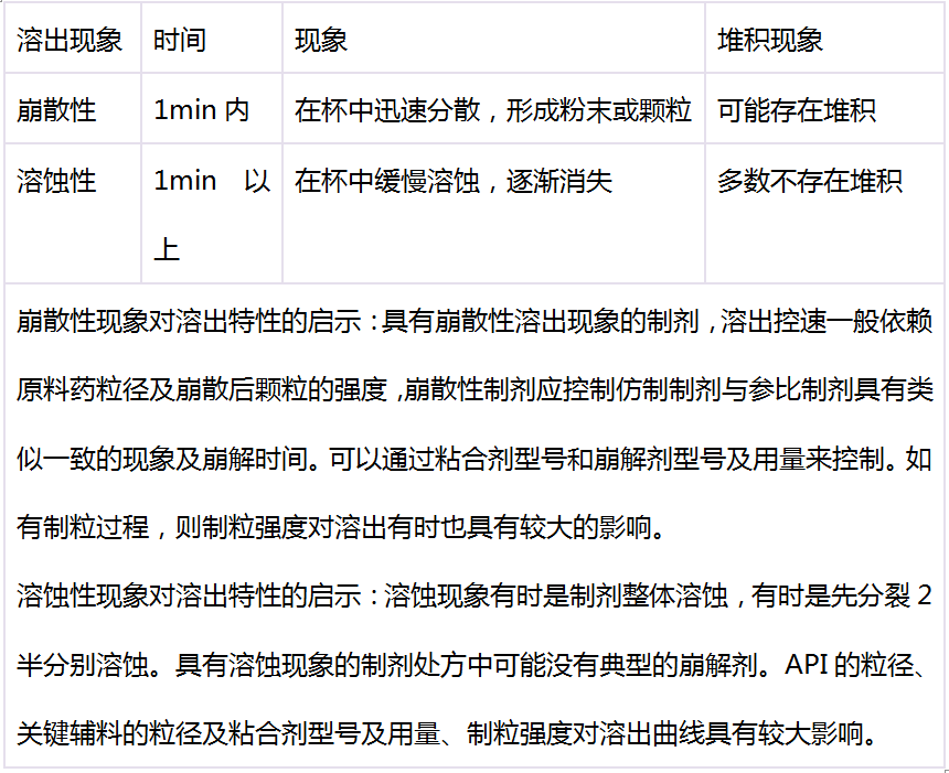 參比制劑溶出現(xiàn)象及溶出數(shù)據(jù)的解讀,在參比制劑溶出特性剖析時(shí),首先應(yīng)重視溶出現(xiàn)象的觀察與思考,溶出現(xiàn)象大致分為兩類,崩散性與溶蝕性。包衣片應(yīng)關(guān)注包衣脫落時(shí)間,膠囊劑應(yīng)關(guān)注膠囊殼破裂時(shí)間,顆粒劑及干混懸劑應(yīng)關(guān)注顆粒分散狀態(tài),如顆粒加入溶出杯中是否有漂浮,是否有聚集 。