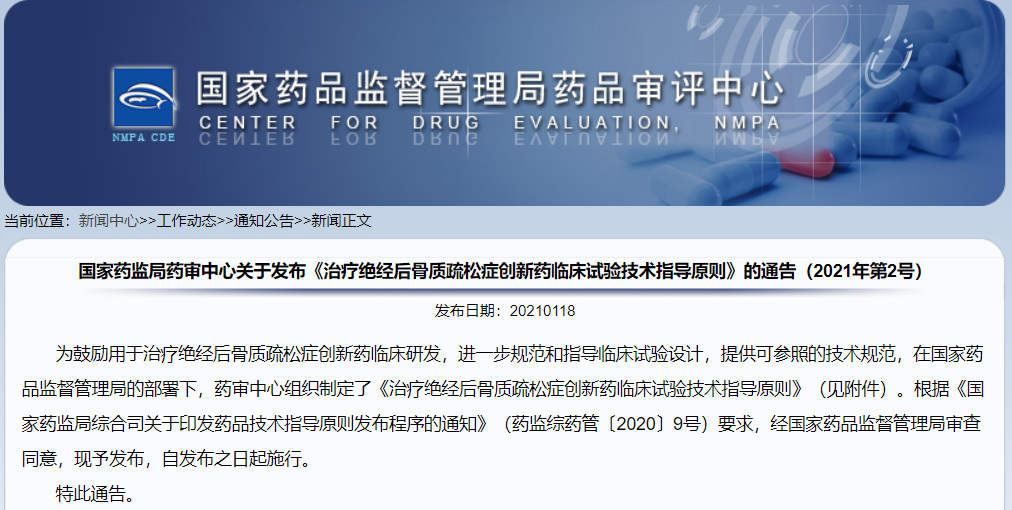 關(guān)于發(fā)布《治療絕經(jīng)后骨質(zhì)疏松癥創(chuàng)新藥臨床試驗技術(shù)指導(dǎo)原則》的通告(2021年第2號)