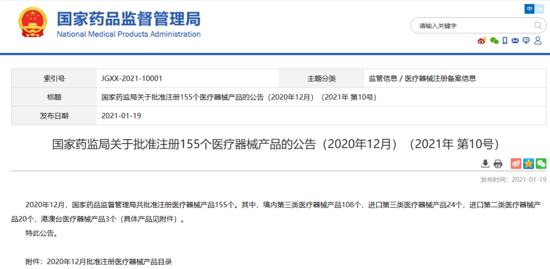 關(guān)于批準(zhǔn)注冊155個醫(yī)療器械產(chǎn)品的公告(2020年12月)(2021年 第10號)
