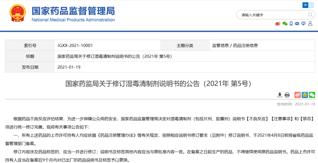 關(guān)于修訂濕毒清制劑說明書的公告(2021年 第5號)