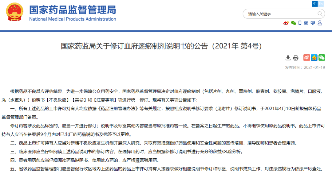 關(guān)于修訂血府逐瘀制劑說明書的公告(2021年 第4號)
