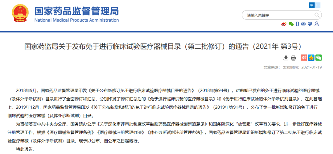 關(guān)于發(fā)布免于進行臨床試驗醫(yī)療器械目錄(第二批修訂)的通告(2021年 第3號)