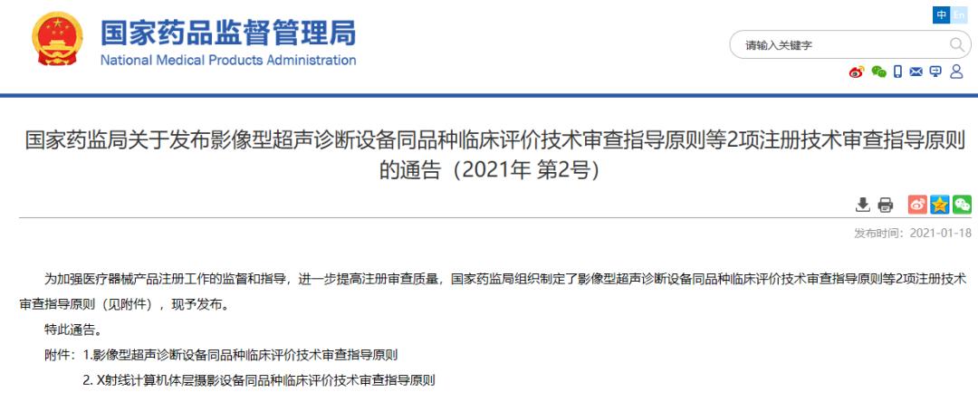 關(guān)于發(fā)布影像型超聲診斷設(shè)備同品種臨床評價技術(shù)審查指導(dǎo)原則等2項注冊技術(shù)審查指導(dǎo)原則的通告(2021年 第2號)