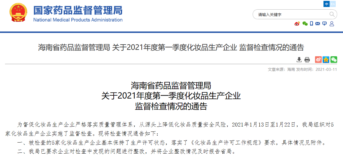 海南省藥品監(jiān)督管理局 關(guān)于2021年度第一季度化妝品生產(chǎn)企業(yè) 監(jiān)督檢查情況的通告
