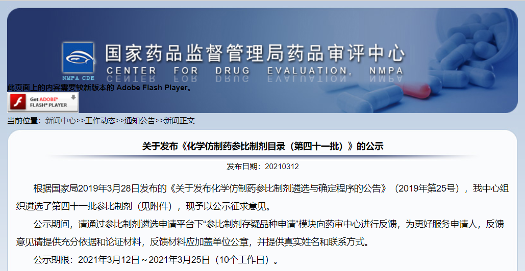 關(guān)于發(fā)布《化學(xué)仿制藥參比制劑目錄(第四十一批)》的公示