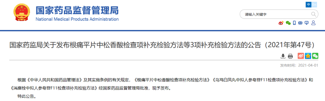 國家藥監(jiān)局關(guān)于發(fā)布根痛平片中松香酸檢查項(xiàng)補(bǔ)充檢驗(yàn)方法等3項(xiàng)補(bǔ)充檢驗(yàn)方法的公告(2021年第47號)