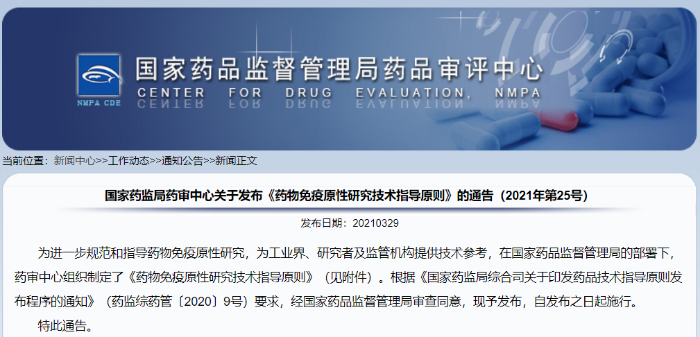 國家藥監(jiān)局藥審中心關(guān)于發(fā)布《藥物免疫原性研究技術(shù)指導(dǎo)原則》的通告(2021年第25號)
