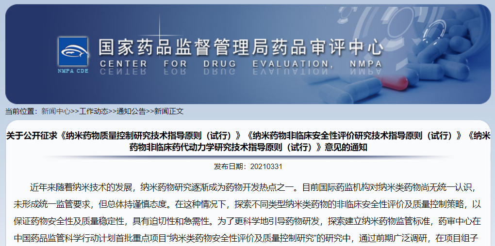 關(guān)于公開征求《納米藥物質(zhì)量控制研究技術(shù)指導(dǎo)原則(試行)》《納米藥物非臨床安全性評價(jià)研究技術(shù)指導(dǎo)原則(試行)》《納米藥物非臨床藥代動(dòng)力學(xué)研究技術(shù)指導(dǎo)原則(試行)》意見的通知(2021-03-31)