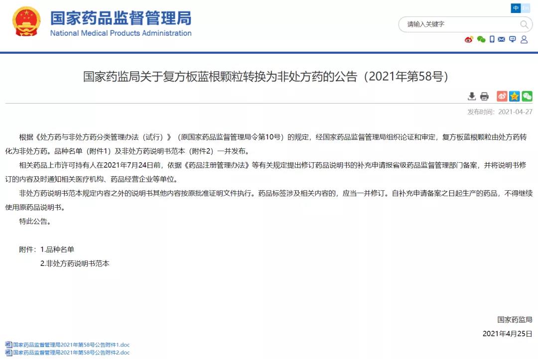 國家藥監(jiān)局關(guān)于復方板藍根顆粒轉(zhuǎn)換為非處方藥的公告(2021年第58號)