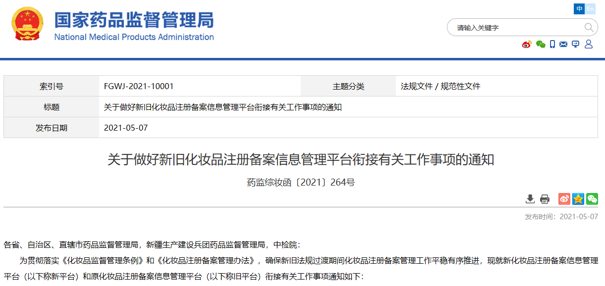 關(guān)于做好新舊化妝品注冊(cè)備案信息管理平臺(tái)銜接有關(guān)工作事項(xiàng)的通知