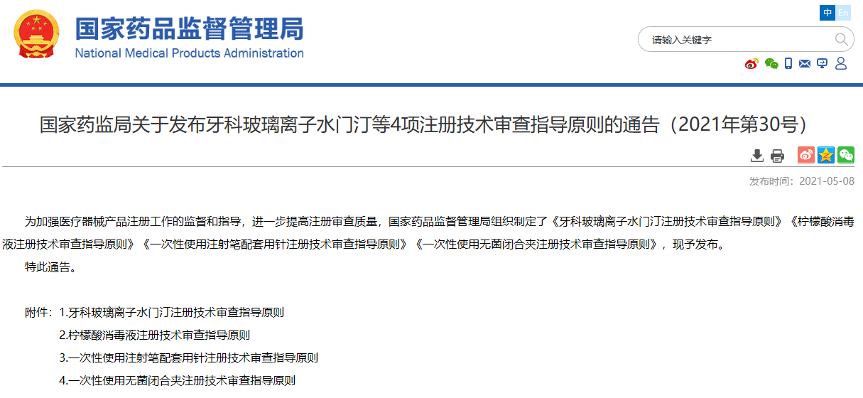 關(guān)于發(fā)布牙科玻璃離子水門汀等4項(xiàng)注冊(cè)技術(shù)審查指導(dǎo)原則的通告(2021年第30號(hào))