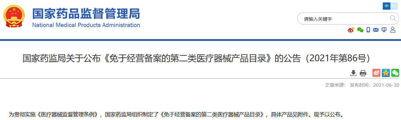關于公布《免于經(jīng)營備案的第二類醫(yī)療器械產品目錄》的公告(2021年第86號)