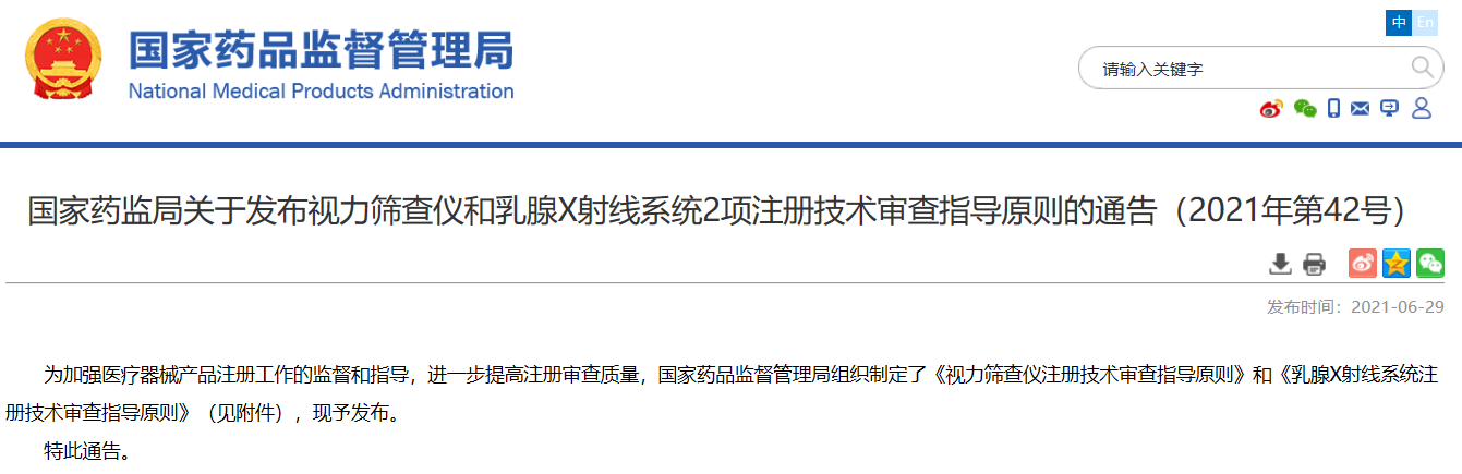 關于發(fā)布視力篩查儀和乳腺X射線系統(tǒng)2項注冊技術審查指導原則的通告(2021年第42號)