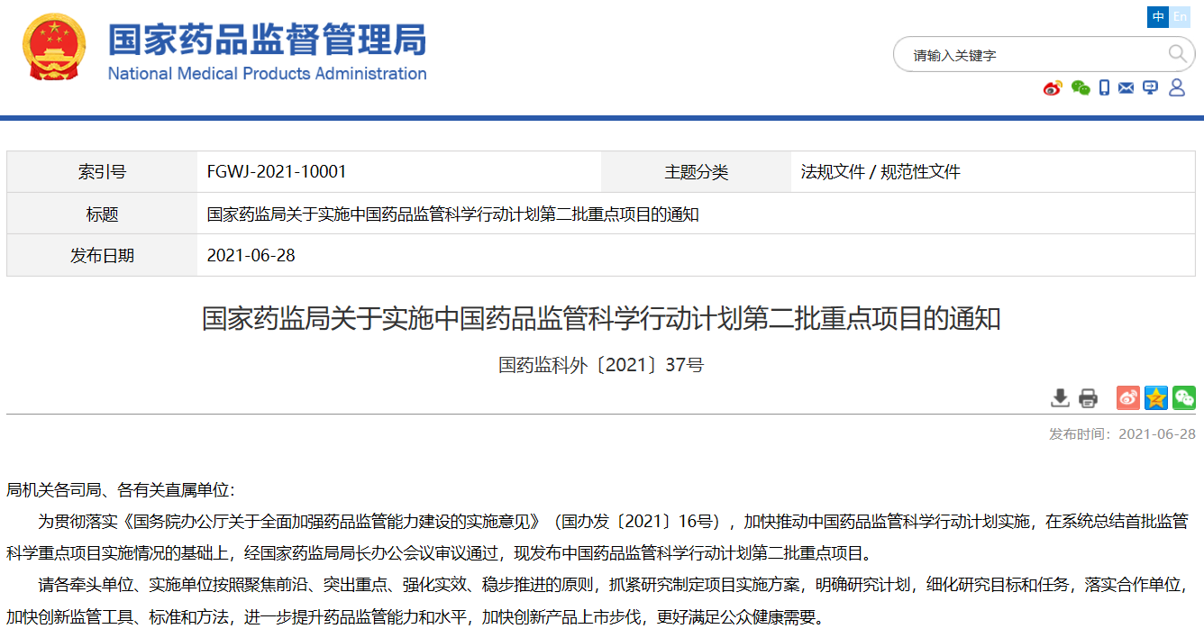 關于實施中國藥品監(jiān)管科學行動計劃第二批重點項目的通知