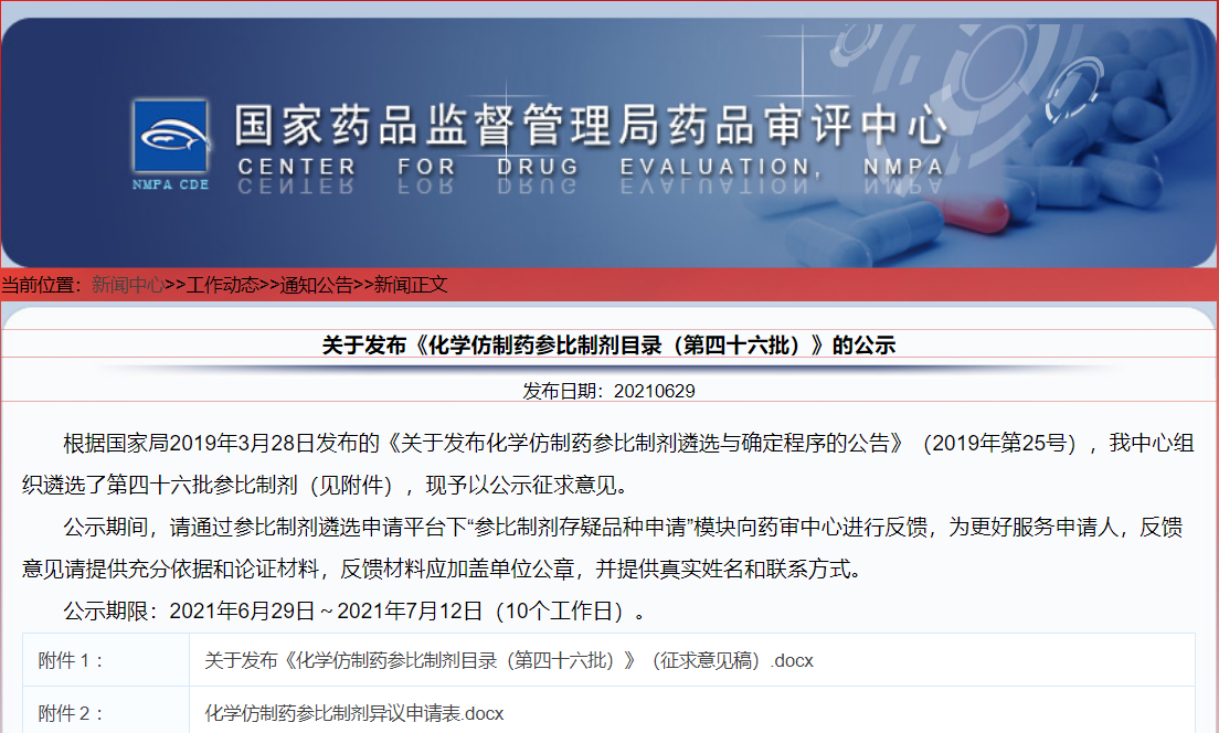 關于發(fā)布《化學仿制藥參比制劑目錄(第四十六批)》的公示