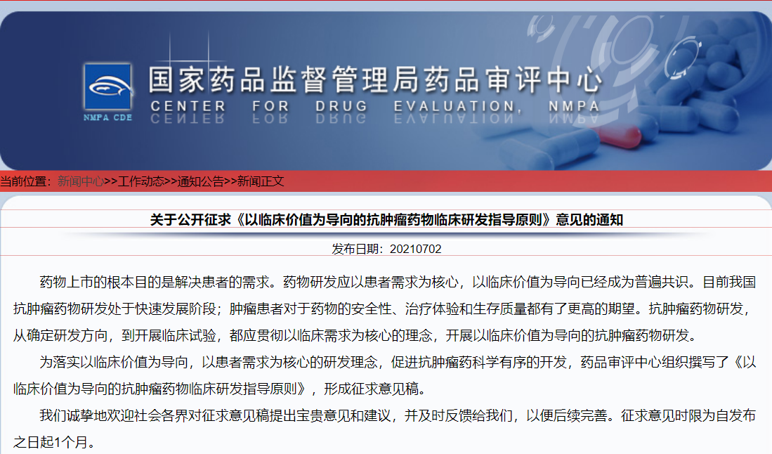 關于公開征求《以臨床價值為導向的抗腫瘤藥物臨床研發(fā)指導原則》意見的通知