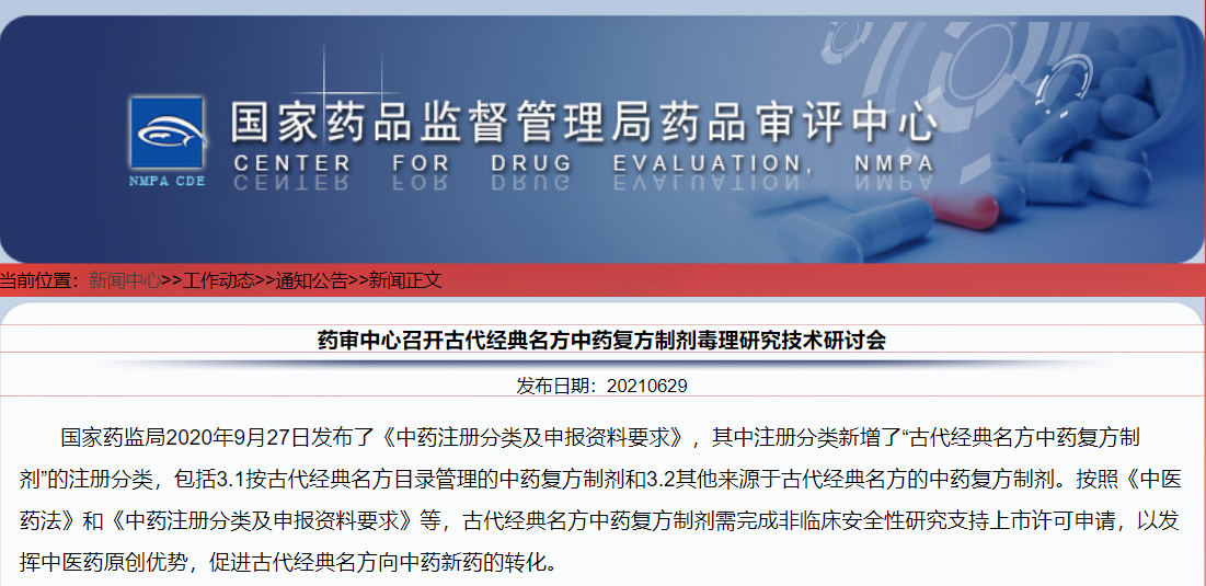 針對古代經(jīng)典名方中藥復方制劑申報可能帶來的重復開展毒理學試驗問題,2021年6月16日,藥審中心藥理毒理學部組織召開了古代經(jīng)典名方中藥復方制劑毒理研究技術研討會,來自國內十余家中醫(yī)藥企業(yè)的研究專家,以及GLP中心和藥物安全性評價相關專業(yè)委員會的毒理學專家參加了會議,對如何規(guī)范和引導此類產品合理開展非臨床安全性評價、促進研究和上市進行了研討。