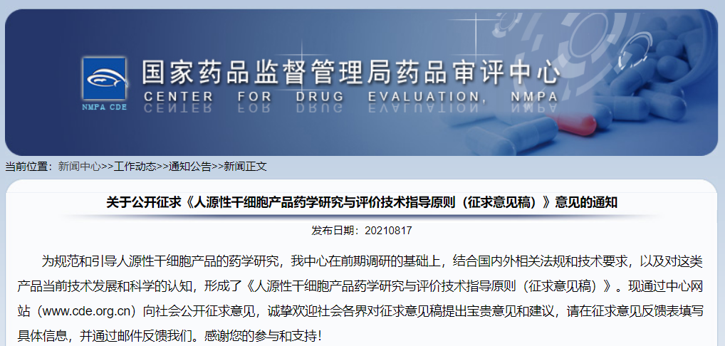 關于公開征求《人源性干細胞產品藥學研究與評價技術指導原則(征求意見稿)》意見的通知