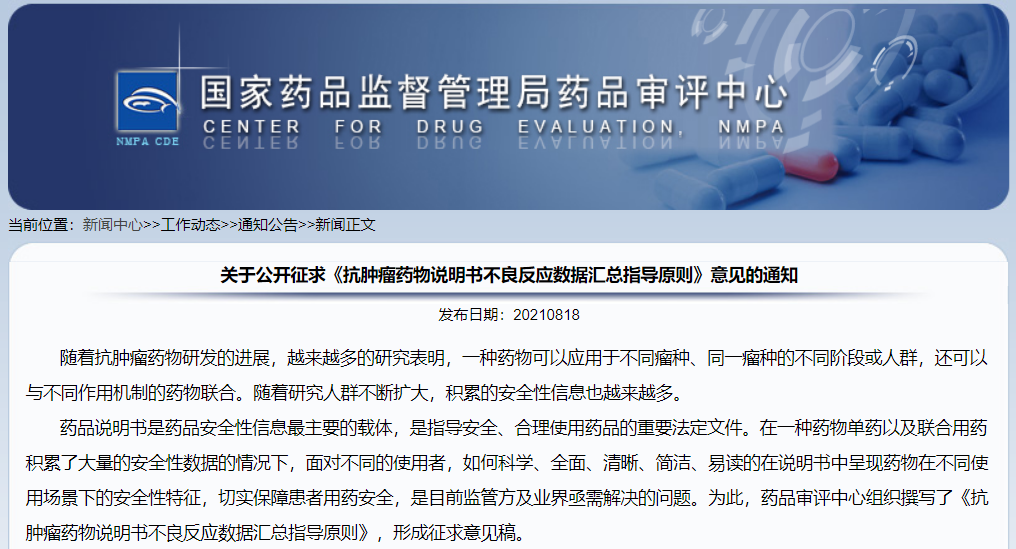 關于公開征求《抗腫瘤藥物說明書不良反應數據匯總指導原則》意見的通知