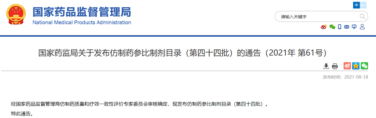 關于發(fā)布《化學仿制藥參比制劑目錄(第四十四批)》的公示(征求意見稿)