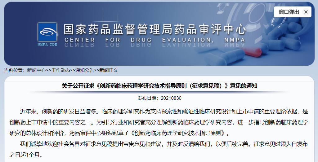 關(guān)于公開征求《創(chuàng)新藥臨床藥理學研究技術(shù)指導原則(征求意見稿)》意見的通知