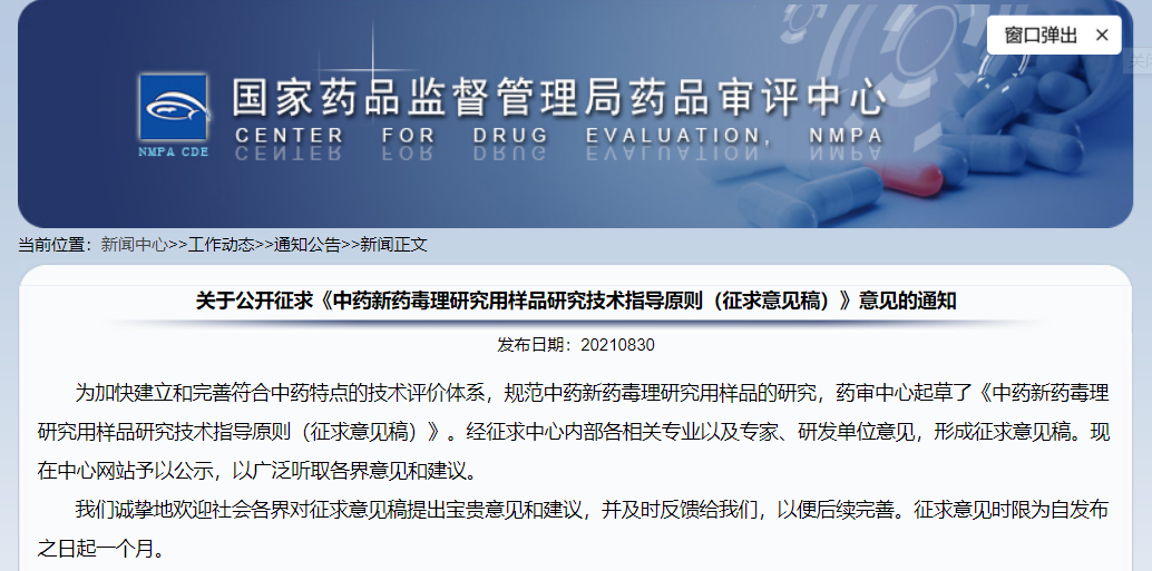 關(guān)于公開征求《中藥新藥毒理研究用樣品研究技術(shù)指導原則(征求意見稿)》意見的通知