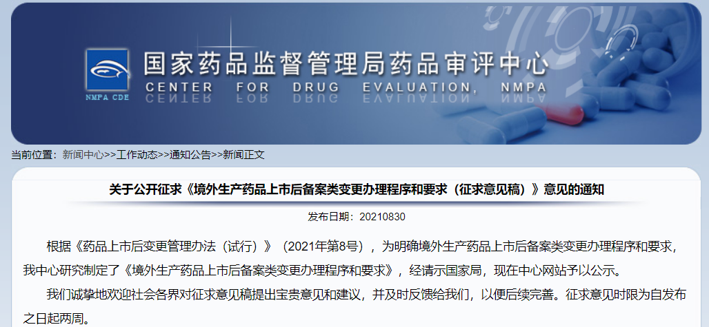 關(guān)于公開征求《境外生產(chǎn)藥品上市后備案類變更辦理程序和要求(征求意見稿)》意見的通知
