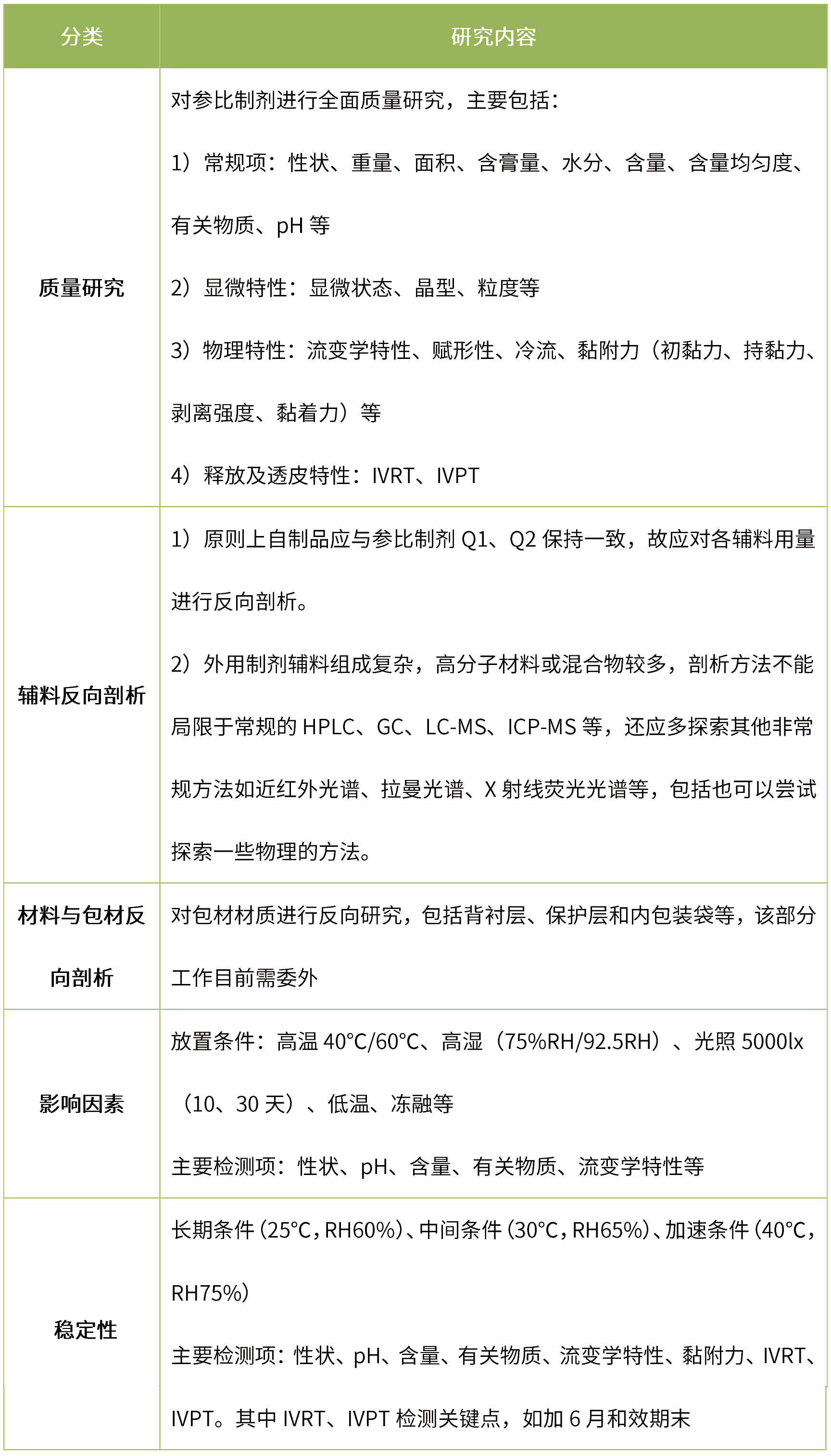 對(duì)小試放大樣品進(jìn)行全面質(zhì)量研究,包括常規(guī)項(xiàng)(性狀、含膏量、水分、含量、含量均勻度、有關(guān)物質(zhì)、pH等)、顯微特性(顯微狀態(tài)、晶型、粒度等)、流變學(xué)特性、賦形性、冷流、黏附力(初黏力、持黏力、剝離強(qiáng)度、黏著力)、IVRT、IVPT等,各質(zhì)量屬性應(yīng)與參比制劑一致。